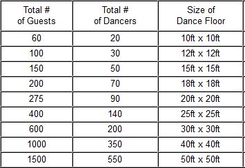If space is not an issue, use the chart below as a reference guide to what size dance floor you require.